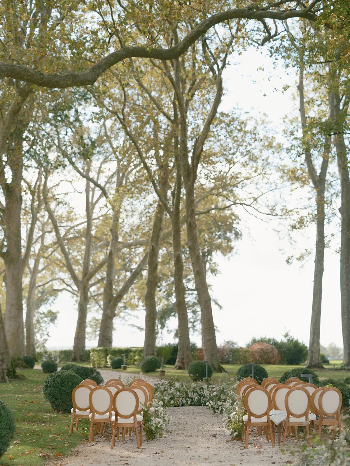 Burgundy · Stone manor · Natural settingVarennes is the most naturalistic chateau wedding venue on this list. The building is local stone, closer to a manor house than a classical Loire Valley chateau, and the outdoor ceremony takes place not in front of the facade but under a canopy of very tall trees, on a gravel path between established garden beds. There is no theatrical backdrop here. The trees are the architecture.